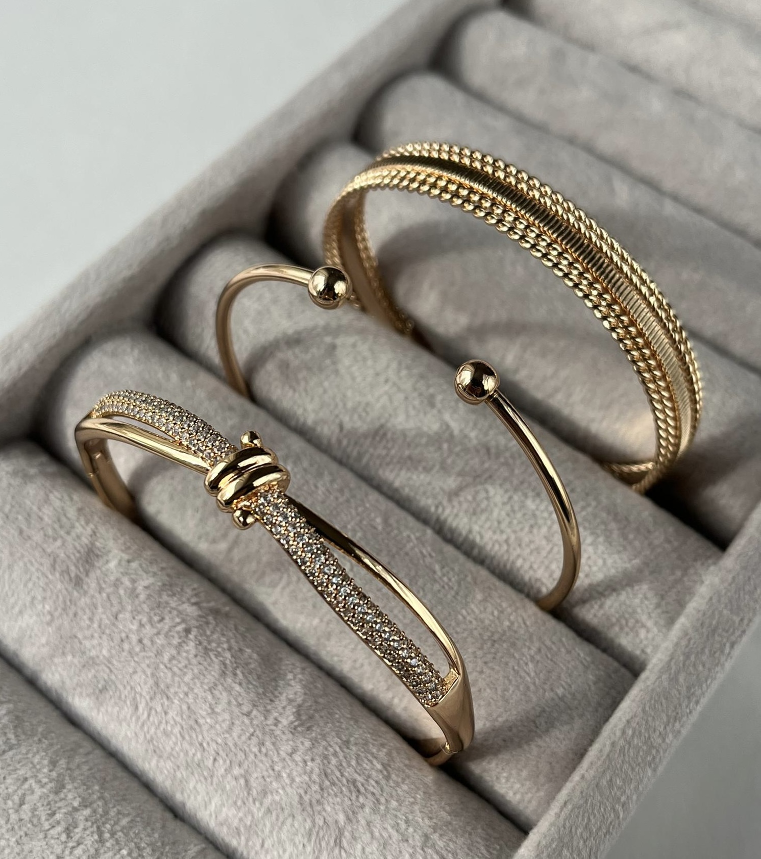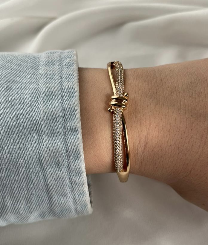 بنگل جواهری زنانه طرح گره از برند ژوپینگ آبکاری طلای ۱۸ عیار و کاملا ضدحساسیت ثبات رنگ عالی قطر بنگل ۵/۷ سانتی متر هست نگین های درخشان مخراجکار کاملا مشابه طلا