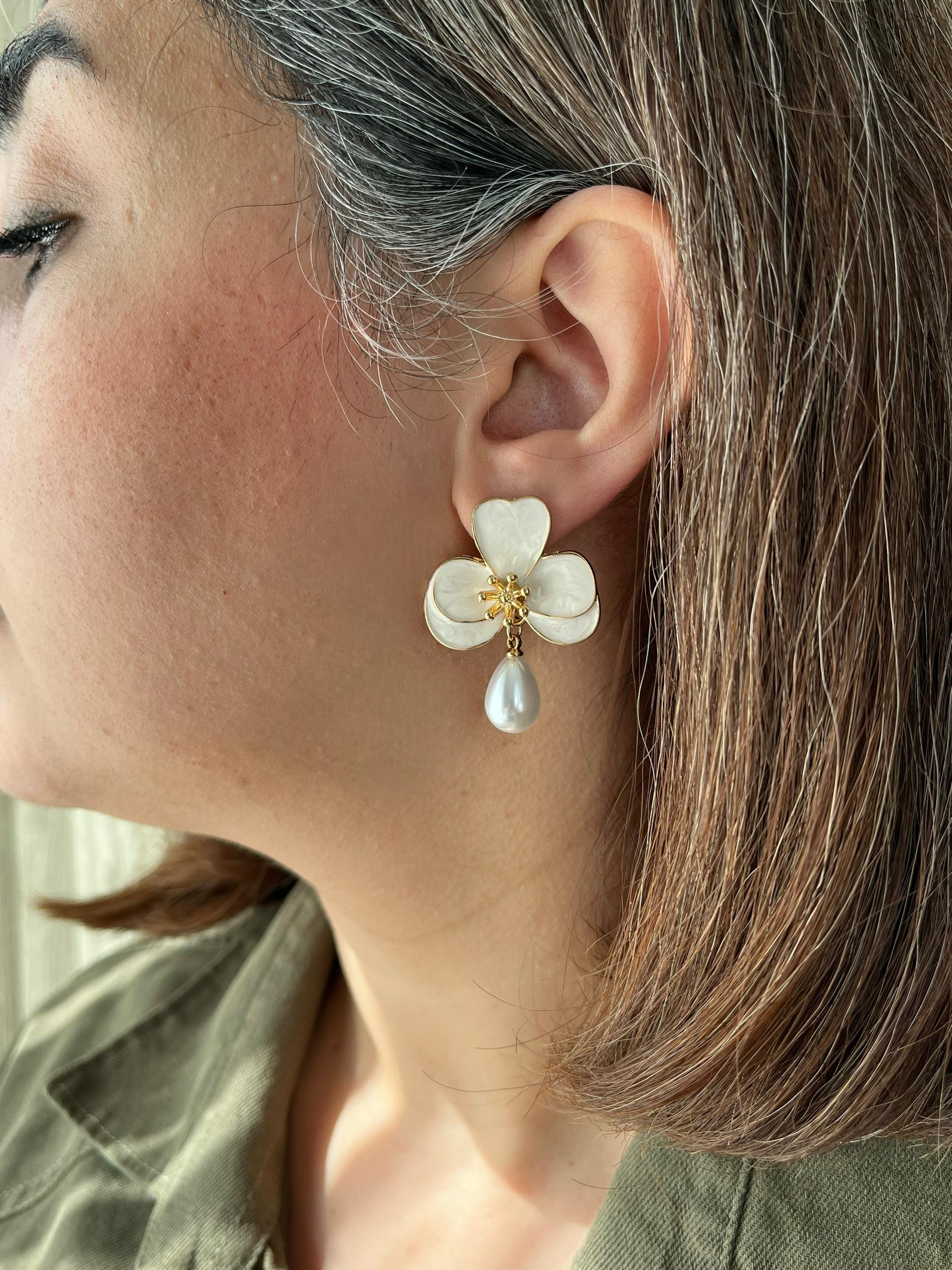 گوشواره میناکاری زنانه طرح ارکید مرواریدی روی کار میناکاری شده مدل گوشواره میخی می باشد میخ کار آبکاری نقره دارد و ضدحساسیت هست