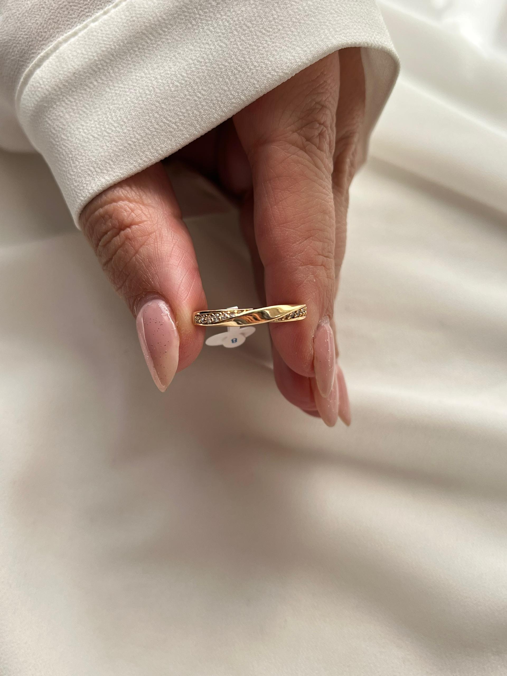 رینگ جواهری ظریف طرح پیچ ژوپینگ اصل بسیار مشابه طلا دارای سایزبندی آبکاری طلا ضدحساسیت نگینهای درخشان مخراجکار ثبات رنگ عالی در صورت استفاده صحیح