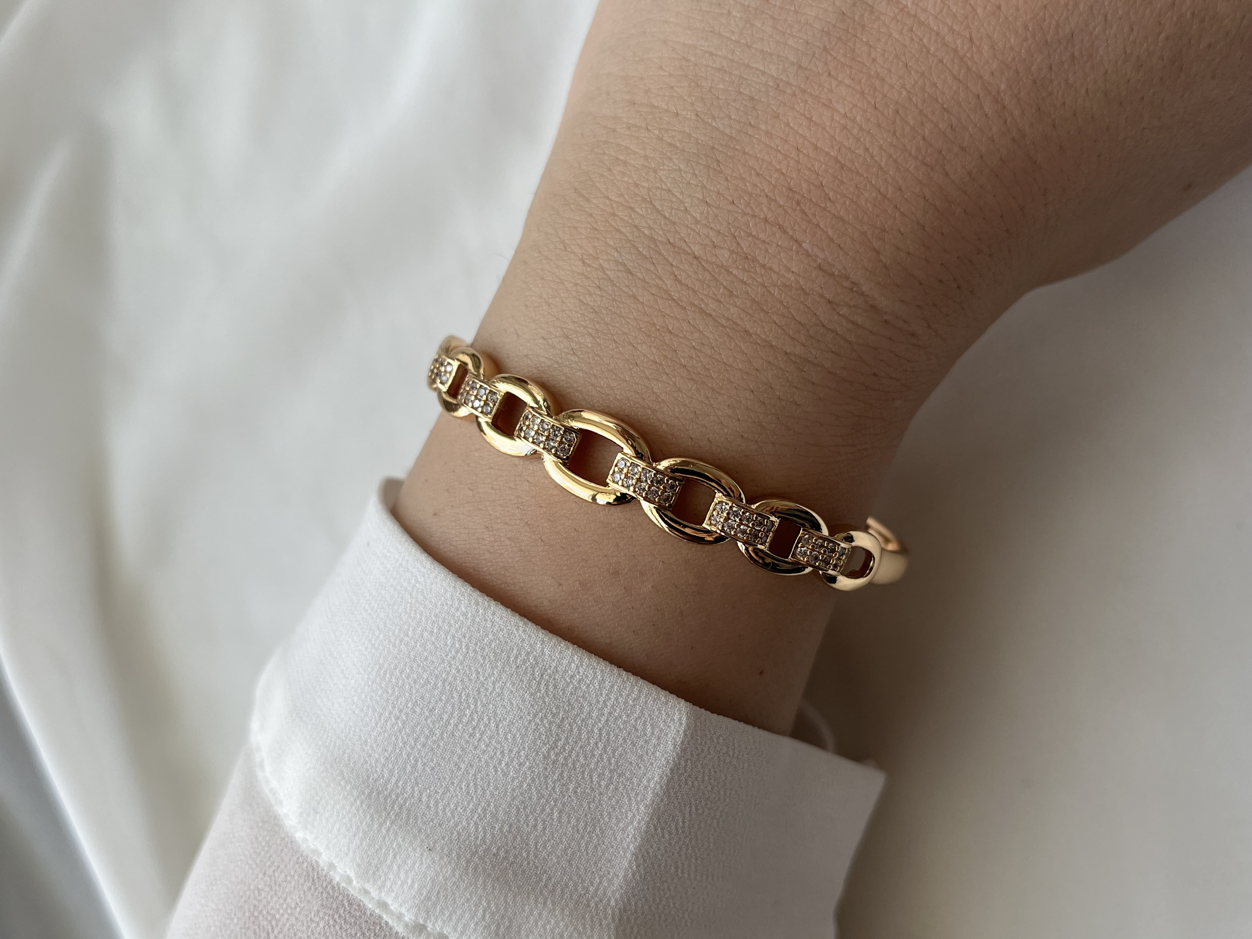 بنگل جواهری زنانه طرح کارتیه برند ژوپینگ آبکاری طلا ۱۸ عیار ضدحساسیت قطر ۵/۷ سانتی متر نگین های مخراجکار درخشان