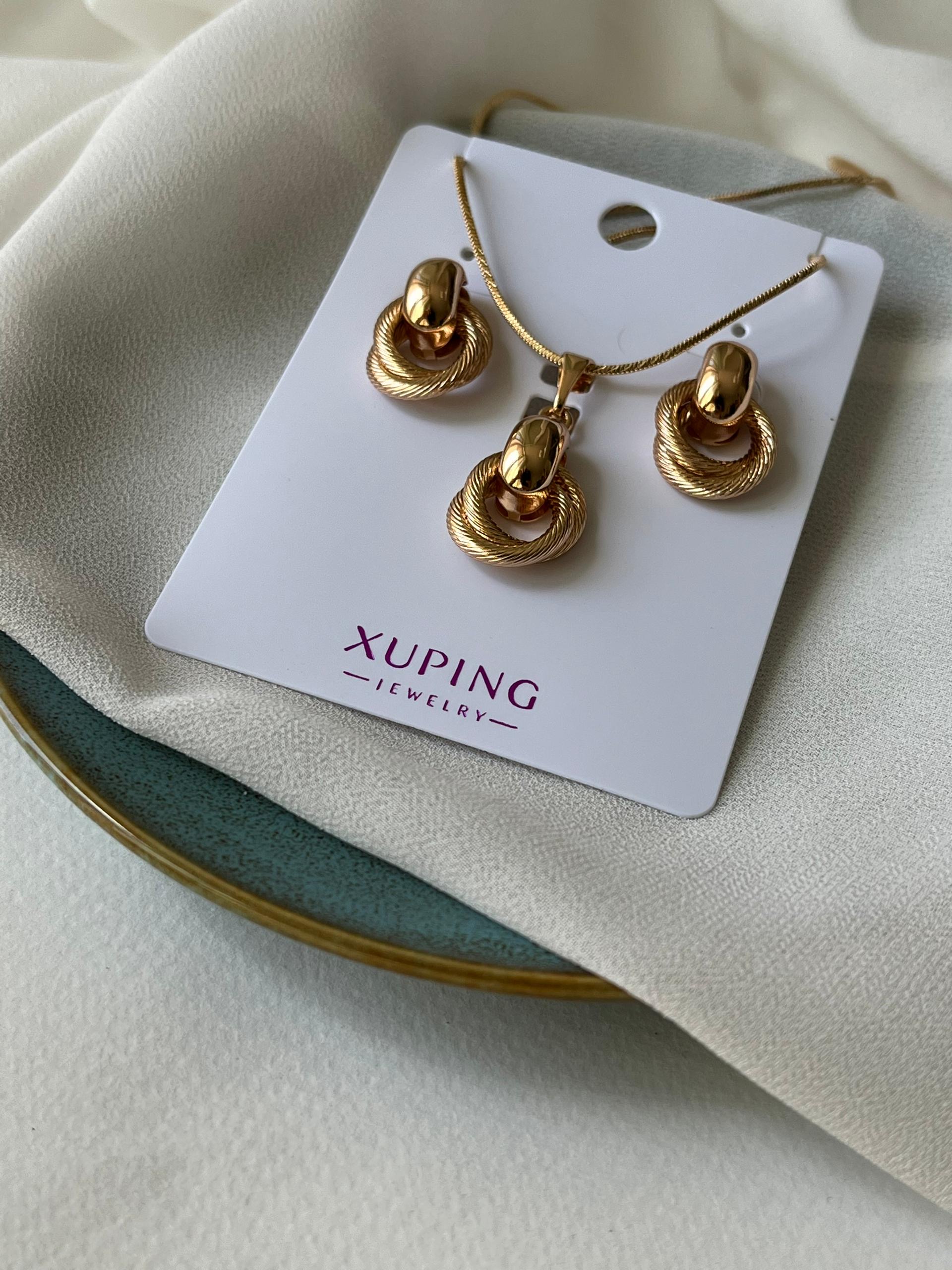 نیمست گره برند ژوپینگ اندازه مدال گردن حدودا ۳سانتی متر اندازه گوشواره ها حدودا ۲ سانتی متر آبکاری طلا ۱۸ عیار ضدحساسیت ثبات رنگ عالی زنجیر از برند ژوپینگ موجود هست