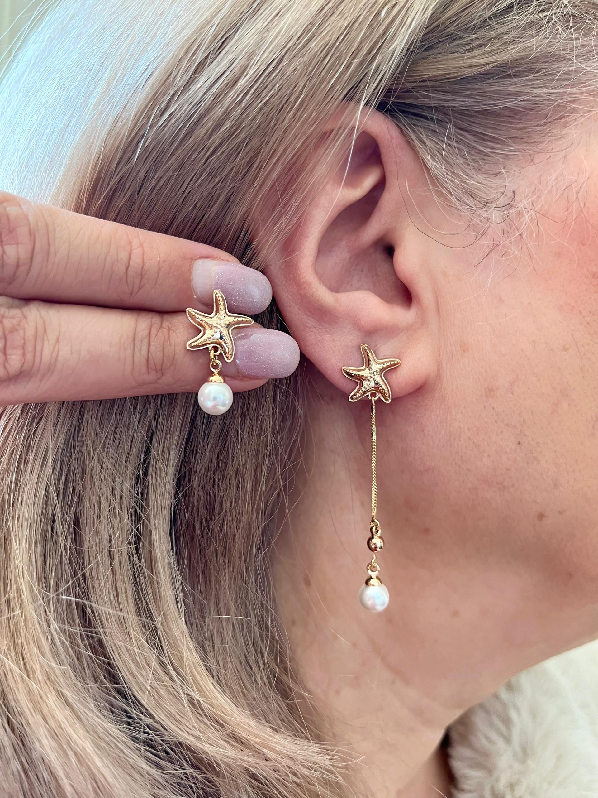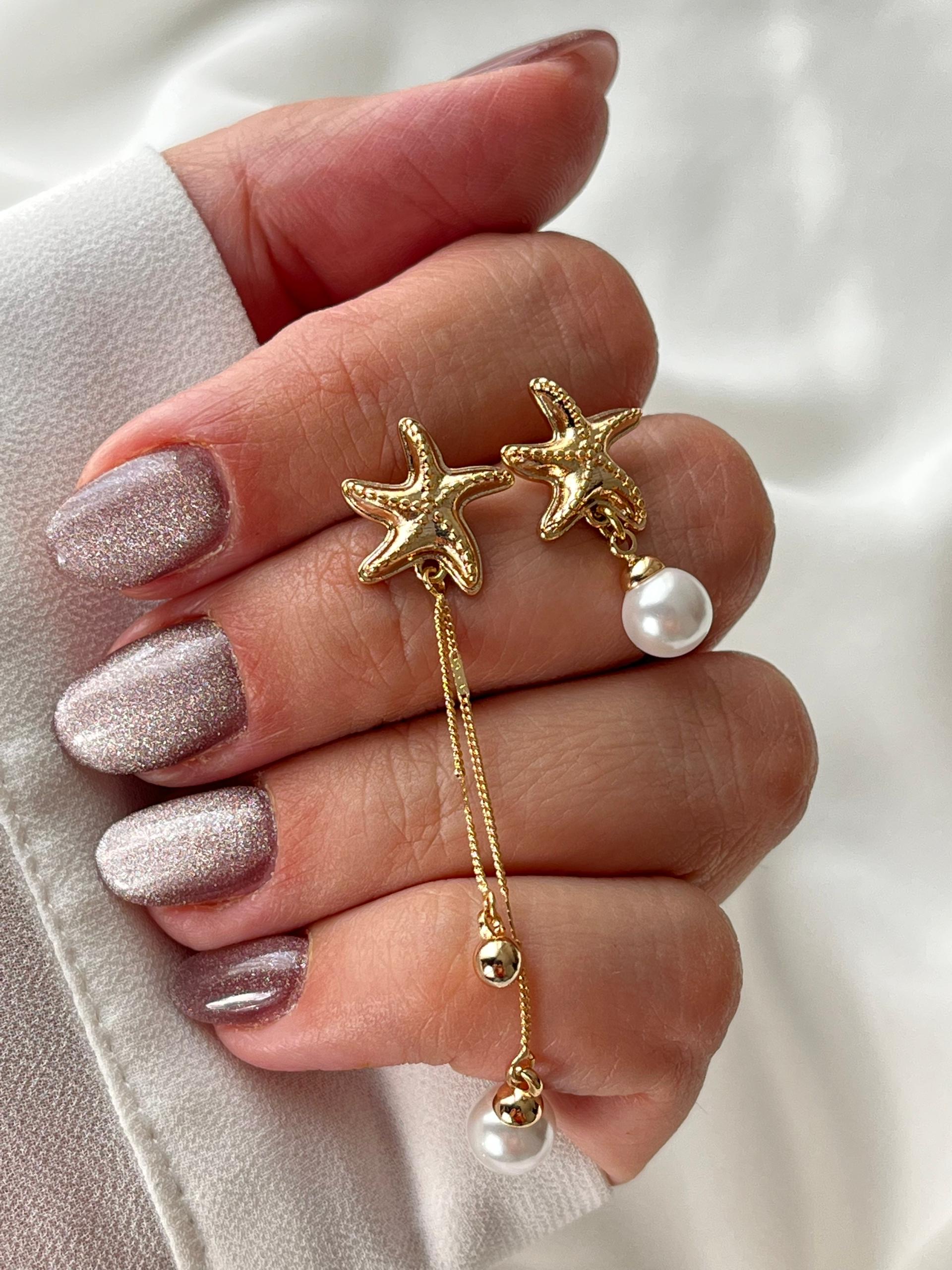 گوشواره ناهماهنگ ستاره مرواریدی مدل میخی برند ژوپینگ ضدحساسیت ثبات رنگ عالی آبکاری طلا ۱۸ عیار اندازه حدودا ۶ سانتی متر و ۲ سانتی متر