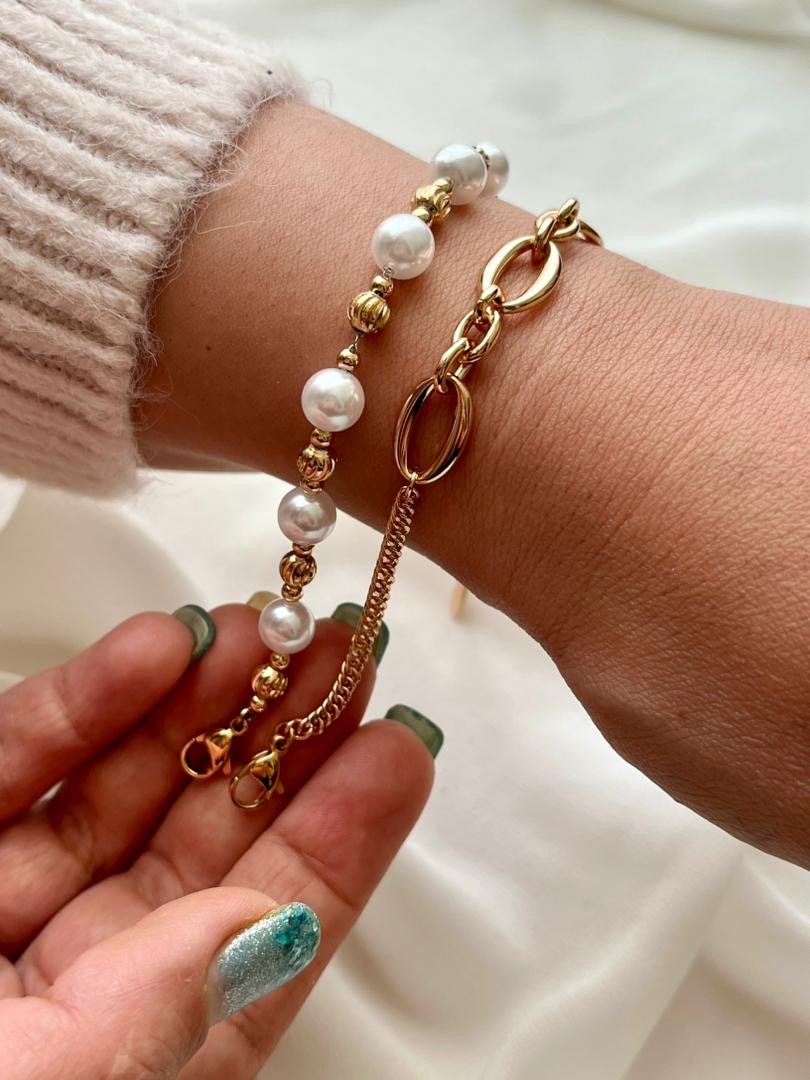 دستبند مرواریدی سانا برند ژوپینگ ضدحساسیت آبکاری طلا ۱۸ عیار ثبات رنگ عالی در صورت استفاده صحیح اندازه دستبند با احتساب قفل حدودا ۲۰ سانتی متر