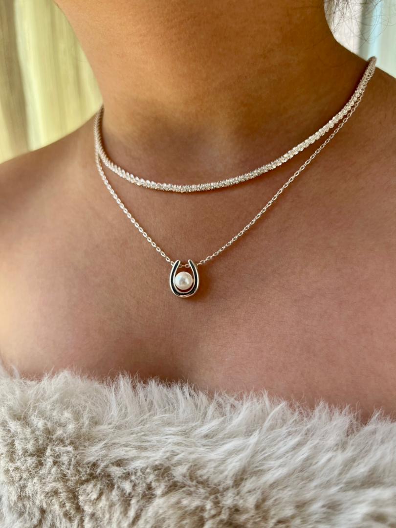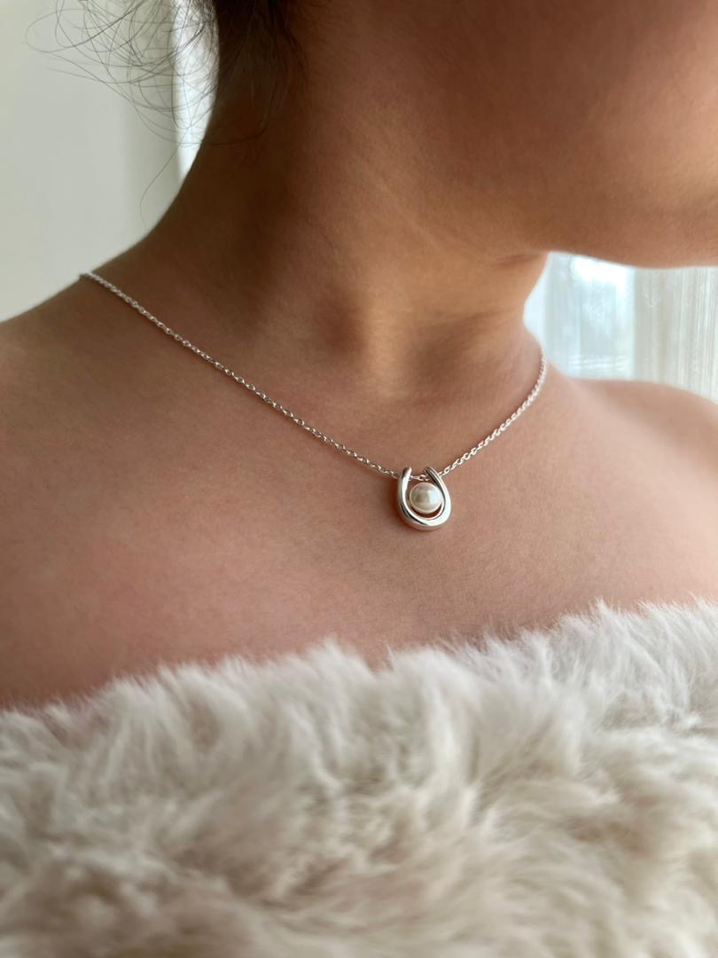 گردنبند نعل مرواریدی آبکاری نقره ضدحساسیت ثبات رنگ بالا در صورت استفاده صحیح و دوری از مواد شوینده و الکل اندازه :۴۱ سانتی متر+۵ سانتی متر زنجیر رگلاژ
